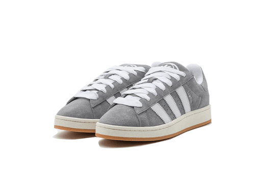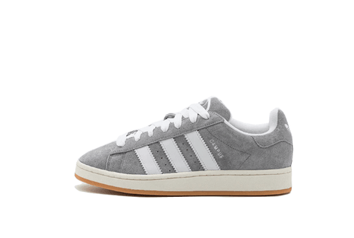 La Adidas Campus 00s Grey White (Gris) présente une base en cuir gris, accompagnée de trois épaisses bandes blanches sur le panneau latéral, caractéristiques de la marque et accordées au heel tab. Proche de la Campus 80s, ce modèle dévoile également une semelle jaunie, pour accentuer l'effet vintage, assortie d'une outsole en gomme. Contrairement à la version adulte, la semelle est blanche sur les modèles GS.