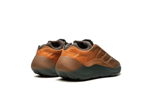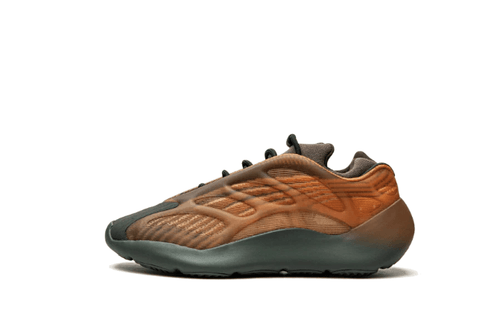La Adidas Yeezy 700 V3 Copper Fade présente une base en mesh marron aux nuances orangées tout le long de l'empeigne. Une cage translucide en TPU ainsi que des rayures brunes épousent les panels de la silhouette. La semelle EVA, les lacets ainsi que la toe box affichent une teinte noire aux reflets gris.