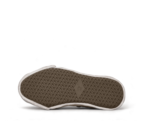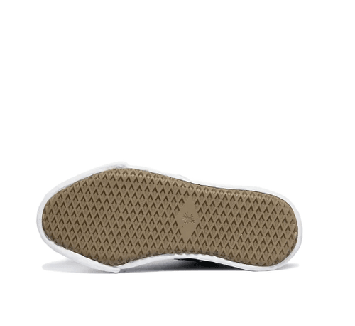 La Maison Mihara Yasuhiro Hank OG Sole Over-Dyed Canvas Low Brown se présente à travers une structure en toile beige, accompagnée d'une semelle déformée en caoutchouc blanc, volontairement vieillie pour un effet vintage. Cette silhouette défie les conventions et attire le regard tandis que des coutures apparentes en relief ajoutent une touche artisanale et authentique à la conception.